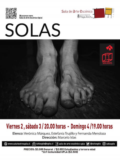 Se trata de Solas, dirigida por Marcelo Islas, investigador y académico de la carrera de teatro y las actrices egresadas de la casa de estudios Estefanía Trujillo, Fernanda Mendoza junto a la actriz Verónica Márquez. El montaje se presentará en Sala UPLA el viernes 02 y sábado 03 de diciembre a las 20 horas y el domingo 04 a las 19 horas.