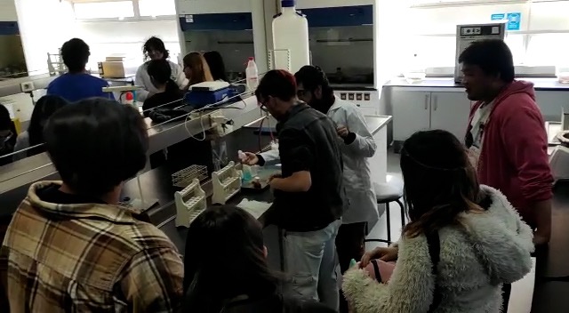 Durante 2 horas, un grupo de 30 estudiantes de cuarto medio realizó actividades prácticas en los laboratorios de la Facultad de Ciencias Naturales y Exactas, dirigidos y supervisados por académicos y estudiantes de la carrera.