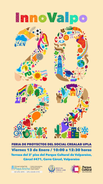 El próximo viernes 13 de enero, entre las 10:00 y las 12:30 horas se llevará a cabo “InnoValpo 2022: Feria de Proyectos Social CreaLab UPLA”, iniciativa que reunirá a los 18 proyectos pertenecientes al Fondo Social CreaLab 2022, promovido por la Dirección General de Vinculación con el Medio (DGVM) de la Universidad de Playa Ancha (UPLA), los que se ejecutaron con el fin de apoyar el desarrollo de distintas comunidades de la región de Valparaíso en materias como medio ambiente, educación, salud, género, derechos humanos, entre otros.