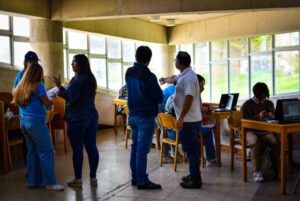 Un equipo multidisciplinario de funcionarios, funcionarias y estudiantes de la Universidad de Playa Ancha, tanto del campus Valparaíso como San Felipe, trabaja arduamente en el Proceso de Matrícula 2023, el cual se realiza de manera 100% virtual y, a la par, cuenta con una Mesa de Ayuda Telefónica y atención presencial dirigida a quienes deseen efectuar el trámite de forma directa en la casa de estudios.