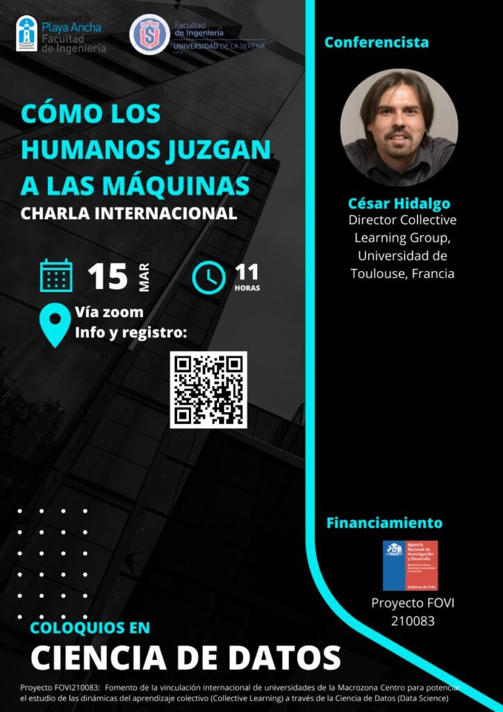 ¿Cómo los humanos juzgan a las máquinas?, así se denomina la charla virtual que dictará César Hidalgo, director del Centro de Aprendizaje Colectivo del Instituto de Inteligencia Artificial y Natural de Toulouse (ANITI) de la Universidad de Toulouse (Francia), en una nueva versión de los Coloquios de Ciencia de Datos, que organiza la Facultad de Ingeniería de la Universidad de Playa Ancha.