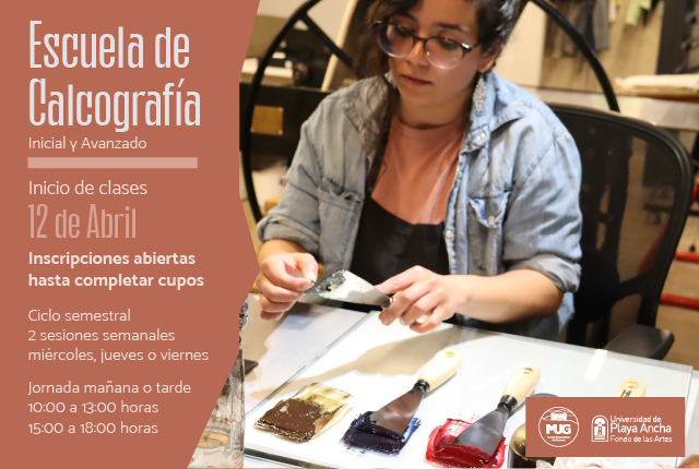 El nivel “Iniciación a la Calcografía”, se enfoca en el tratamiento del metal mediante las tres técnicas base de la calcografía: punta seca, aguafuerte y aguatinta. Mientras que “Calcografía Avanzada”, está dirigido para personas con conocimientos y formación previa, para ingresar a este nivel, se solicitará al postulante una entrevista y portafolio de obras. Este curso avanzado considera una planificación personalizada y se ajusta a los intereses creativos de cada estudiante.