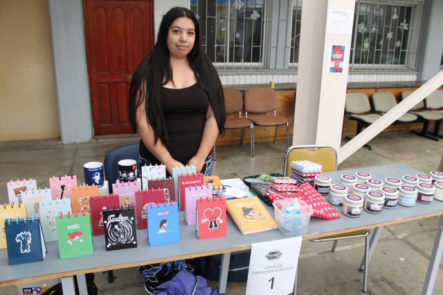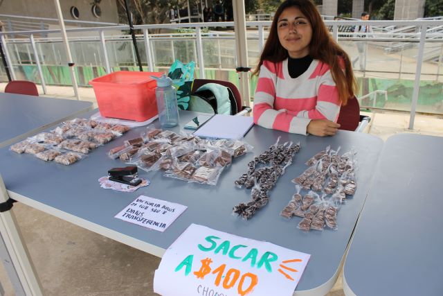 Victoria Aros, estudiante de 3° año de Pedagogía en Matemática, siempre ha vendido chocolates, cocadas galletas en la Facultad de Ciencias Naturales y Exactas, por lo que esta feria le vino muy bien para potenciar su emprendimiento.