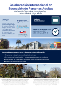 El próximo jueves 13 de abril, entre las 15:00 y las 16:00 horas, se realizará el seminario «Colaboración Internacional en Educación de Personas Adultas», organizado por la Universidad de Playa Ancha y PennState College of Education, de Estados Unidos.