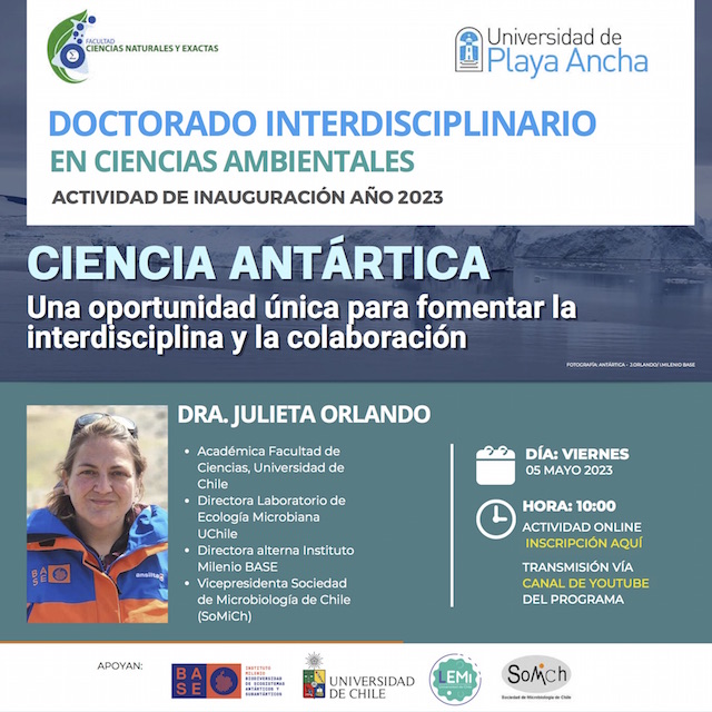 Con una conferencia sobre la ciencia Antártica, a cargo de la Dra. Julieta Orlando, de la Universidad de Chile, el próximo viernes 5 de mayo el doctorado Interdisciplinario en Ciencias Ambientales de la Universidad de Playa Ancha inaugurará su Año Académico 2023.