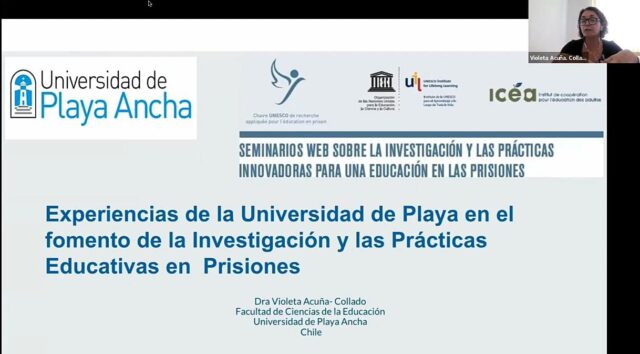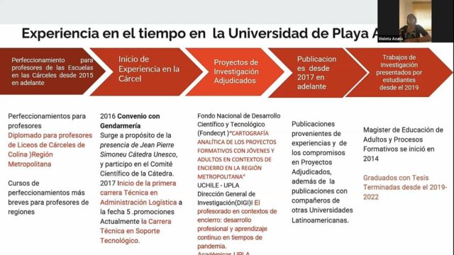 Asimismo, la Dra. Violeta Acuña formó parte del webinar: Prison Education in Latin America, organizado por la Cátedra UNESCO de Investigación Aplicada a la Educación en Prisión, con sede en Montreal, Canadá.