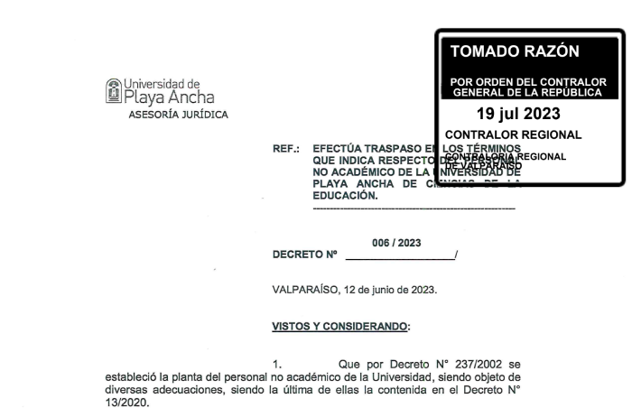 Con la toma de razón del Decreto Nº 006/2023 por parte de la Contraloría Regional de Valparaíso se oficializó el traspaso a la planta de 169 personas vinculadas al estamento de la administración y servicios de la Universidad de Playa Ancha.
