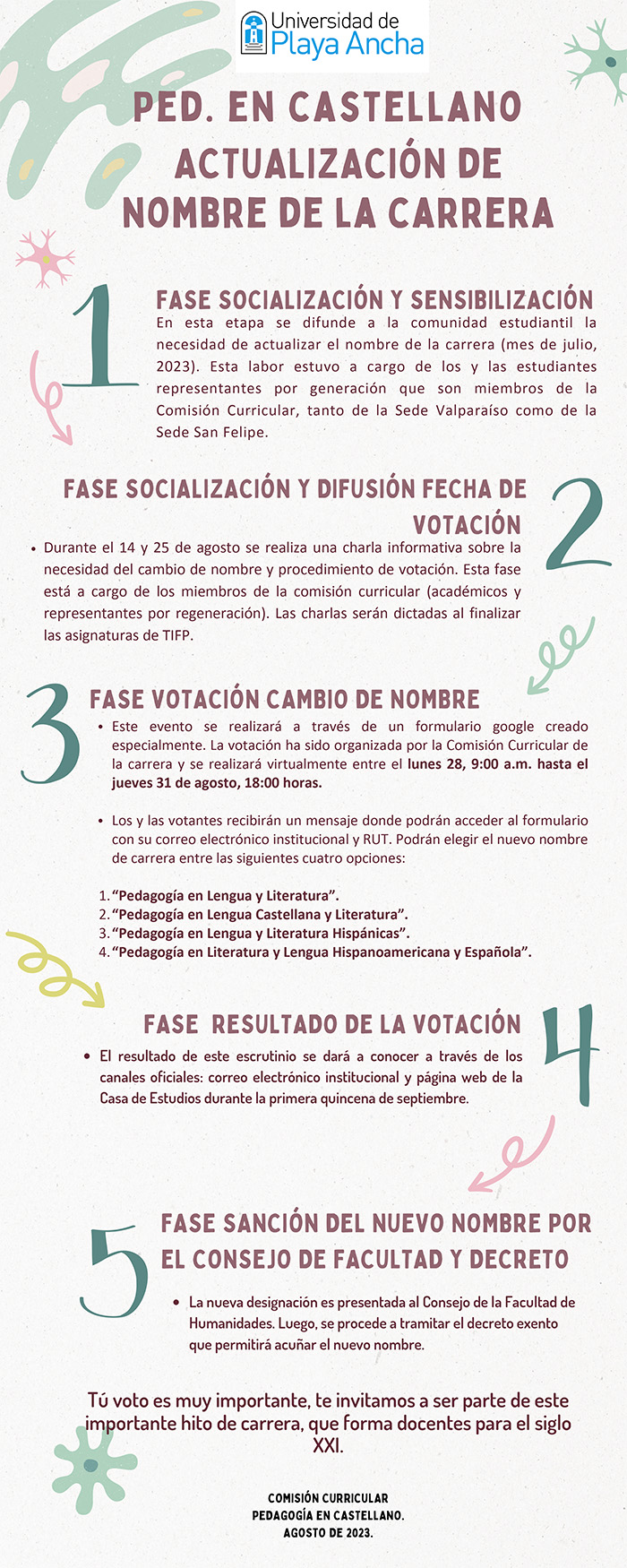 En el marco del Plan de Mejoramiento 2022 de la carrera de Pedagogía en Castellano de la Universidad de Playa Ancha y con el objeto de generar acciones estratégicas clave que permitan revertir las debilidades identificadas en la Resolución Exenta de Acreditación de Pregrado N°735/2022, su comunidad trabaja en la actualización del nombre de la carrera y del Título Profesional de Profesor(a) de Castellano.