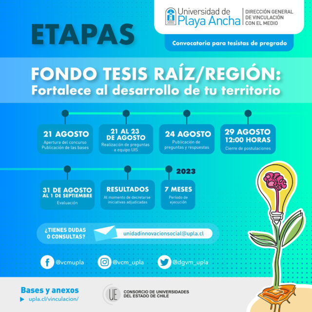 En tanto, las y los interesadas/os podrán realizar sus consultas entre el 21 y 23 de agosto a unidadinnovacionsocial@upla.cl para luego socializar un consolidado de preguntas y respuestas el día 24 de agosto, el que estará disponible a la comunidad en el sitio web de la Dirección.