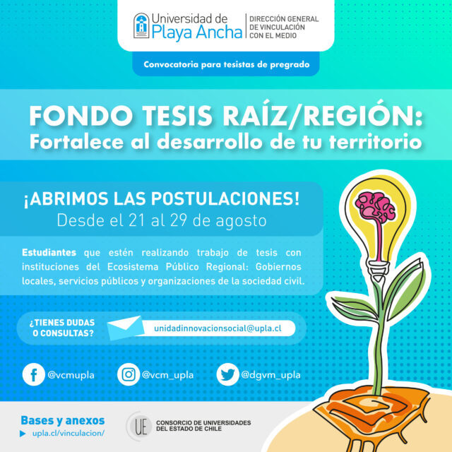 La Dirección General de Vinculación con el Medio (DGVM), a través de su Unidad de Innovación Social (UIS), junto con el Consorcio de Universidades Estatales de Chile (CUECH), invitan a participar del “Fondo Tesis Raíz/Región: Fortalece al desarrollo de tu territorio”, que busca apoyar hasta 6 iniciativas de tesistas de pregrado que se encuentren abordando temáticas en relación a temáticas de interés regional en trabajo directo con agentes del Ecosistema Público Regional como gobiernos locales, servicios públicos y organizaciones de la sociedad civil.