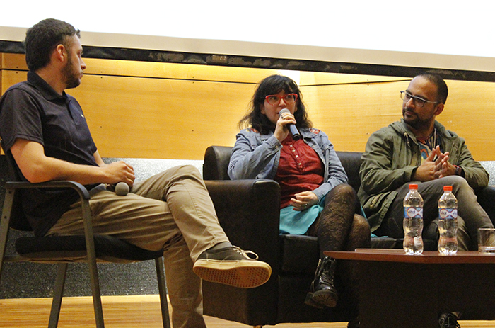 Tras la proyección, quienes dirigieron el largometraje participaron en un conversatorio con el público asistente, el que fue moderado por los estudiantes de periodismo, Vinka Muñoz Castro y Diego Real Fernandini, para ahondar en el cine como una herramienta movilizadora de la memoria.