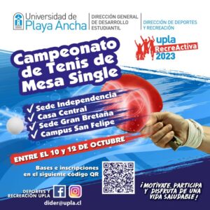 No te quedes sin participar en el Campeonato Recreativo de Tenis de Mesa Single de la Universidad de Playa Ancha, que se realizará entre el 10 y 12 de octubre en las distintas sedes del campus Valparaíso y en el campus San Felipe.