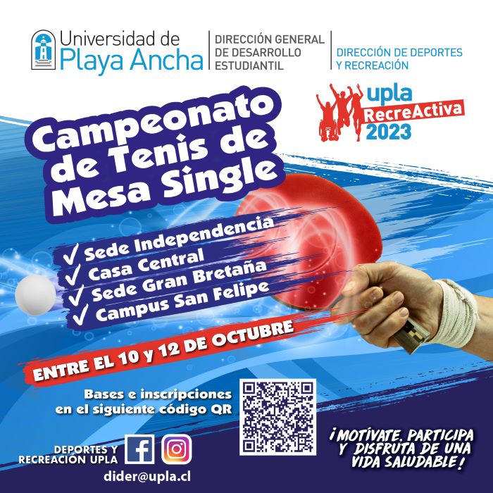No te quedes sin participar en el Campeonato Recreativo de Tenis de Mesa Single de la Universidad de Playa Ancha, que se realizará entre el 10 y 12 de octubre en las distintas sedes del campus Valparaíso y en el campus San Felipe.