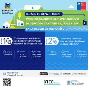 Con el objetivo de compartir conocimiento, experiencias y mejorar continuamente la gestión de los Sistemas de Agua Potable Rural, la Subdirección de Servicios Sanitarios Rurales (SSR) de la Dirección de Obras Hidráulicas junto a la Universidad de Playa Ancha invitan a participar en los cursos de “Capacitación para Administrativos y Operadores de los Servicios Sanitarios Rurales de la Región de Valparaíso”.