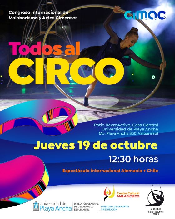 En el marco del XIV Congreso Internacional de Malabarismo y Artes Circenses (CIMAC), que se realizará en Valparaíso entre el 25 y 29 de octubre, la organización del evento traerá a la Universidad de Playa Ancha una delegación de la Escuela Estatal de Artes Escénicas de Alemania, Staatliche Artistenschule de Berlín, que en conjunto con artistas de la Compañía Malabicirco presentarán un espectáculo de artes circenses y de mediación con el público asistente.