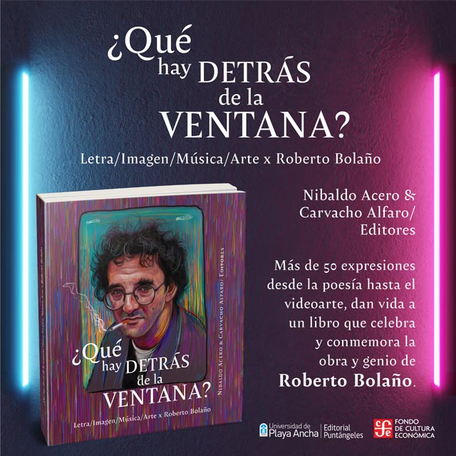 Más de 60 artistas y académicos de distintas disciplinas se reunieron en el nuevo libro de la Editorial Puntángeles, ¿Qué hay detrás de la ventana? Letra/Imagen/Música/Arte x Roberto Bolaño, editado por los escritores y académicos, Nibaldo Acero y Carvacho Alfaro, en coedición con la Editorial del Fondo de Cultura Económica.
