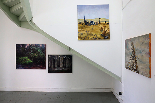 Santibáñez Artigas explicó que su exposición, curada por Nathalie Goffard, se compone de obras de diversos formatos que trabajan sobre el tema del paisaje contemporáneo, destacando en ella las pinturas realizadas sobre folia dorada, material conocido también como pan de oro.