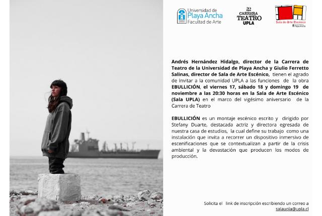 Ebullición estará en cartelera desde el 17 al 19 de noviembre a las 20:30 horas, la entrada es liberada previa reserva escribiendo un correo a salaupla@upla.cl