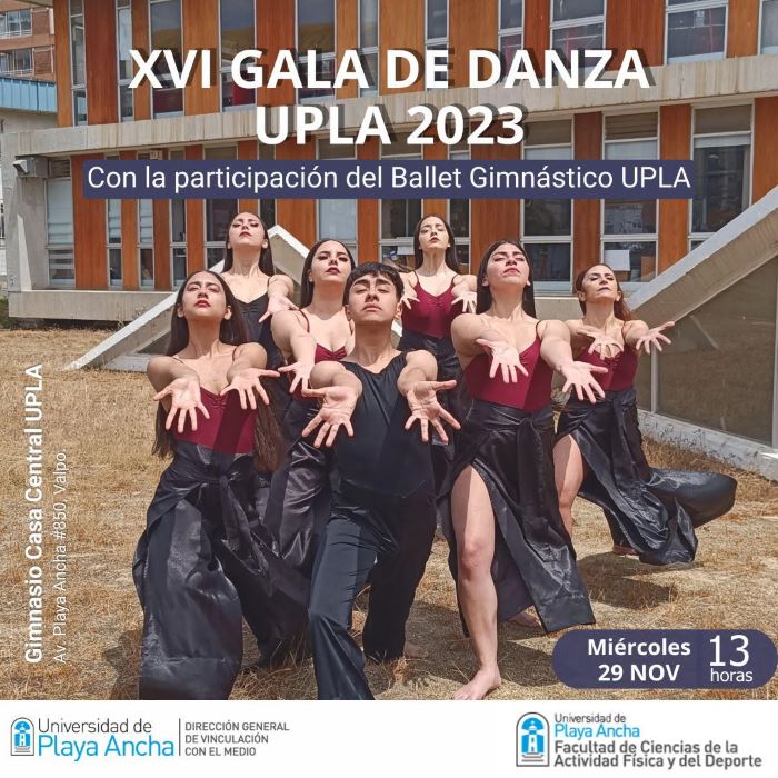 La Dirección General de Vinculación con el Medio, a través de su elenco artístico cultural Ballet Gimnástico, y la Facultad de Ciencias de la Actividad Física y del Deporte invitan a la XVI Gala de Danza UPLA 2023.