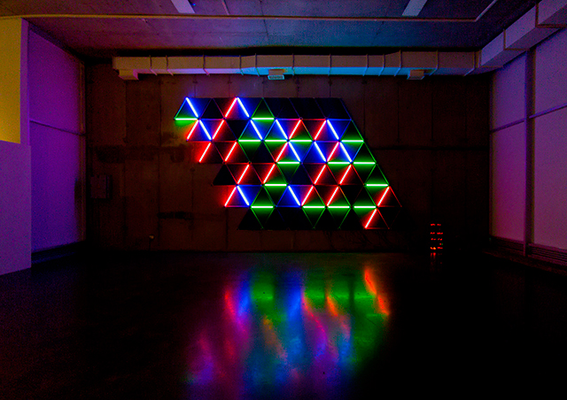 Según palabras del curador Samuel Toro la exposición «Cielo Rojo y Verde y Azul» pone en perspectiva la disolución de las fronteras entre lo que reconocemos como sistemas biológicos y dispositivos electrónicos, y plantea la luz y la programación digital como un creador de espacios de encuentro e interacción humana.