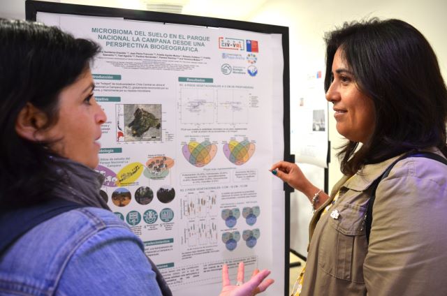 Quinteros, expuso en su póster la tesis “Microbioma del suelo en el Parque Nacional La Campana desde una perspectiva biográfica”, el cual tuvo como objetivo determinar la relación entre la composición y estructura de las comunidades microbianas del suelo, y los factores bióticos y abióticos del paisaje presente al interior del parque, el cual “pertenece a la reserva de la biosfera La Campana-Peñuelas y es representativo de lo que se llama el hotspot o punto caliente de biodiversidad de Chile Central”, afirmó. Los académicos Dr. Jean Pierre Francois y Dra. Verónica Molina cumplieron el rol de tutor y cotutora, respectivamente.