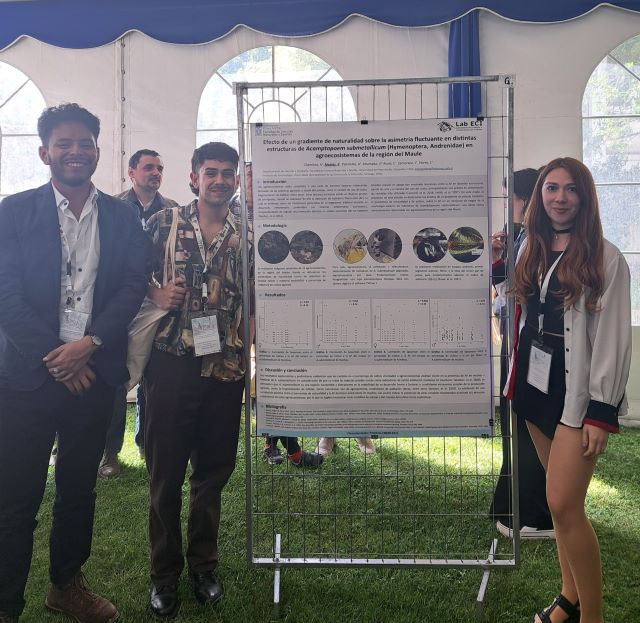 Efecto de un gradiente de paisaje sobre la asimetría fluctuante en Acamptopoeun submetallicum (Hymenoptera, Andrenidae) en agroecosistemas, fue el trabajo que presentaron los estudiantes de cuarto año Franco Álvarez Veliz, Alisson Pailamilla Araya, Valentina Ahumada Berrios y el egresado Arturo Olaechea Chalco.