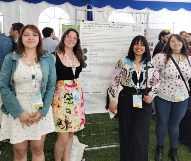 En tanto, las estudiantes Francisca Yáñez Bravo, Tamara Pieper Solís, Anllel Quintana Piña junto a la egresada de la carrera Rocío Alata Pérez, presentaron el póster «Variación de grupos funcionales de abejas silvestres en un gradiente de paisaje en agroecosistemas», con el cual expusieron análisis de cómo el cambio en el paisaje afecta a los grupos funcionales de abejas silvestres en respuesta a la alteración del uso del suelo en un contexto de agroecosistemas. Para lo anterior, se realizaron muestreos en 9 sitios de cultivos de frutillas en la región del Maule, categorizándolos en paisajes semiurbano, cultivo y seminatural.