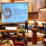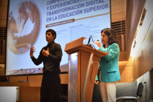 Maryelsa Rojas López, asesora curricular de la Dirección de Estudios e Innovación Curricular y una de las ponentes, relató el desafío de la dirección para la formación transversal del Sello Instrumental de Competencia Digital. En la oportunidad, la profesional puso énfasis en la experiencia con los mecanismos de integración: “Contamos con apoyo de distintas asistencias técnicas y también con el trabajo conjunto de diez planes formativos, los cuales constituyeron una muestra piloto que fuimos abordando desde carreras técnicas, carreras profesionales de pregrado y programas de postgrado, para ir insertando esta competencia transversal. Lo que nos queda, tras ese ejercicio, es el mecanismo para ir incorporándola paulatinamente en toda la oferta académica (y en todos sus niveles formativos)”, concluyó.