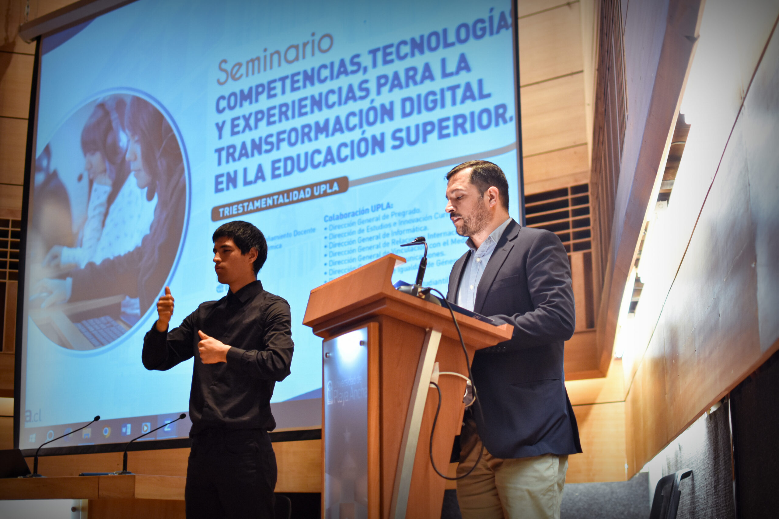 El coordinador de la Unidad de Acompañamiento Docente, Eugenio Contreras Tello, planteó que este seminario quiso mostrar cómo la universidad capacita a sus funcionarios, funcionarias y estudiantes, y les entrega herramientas para el desarrollo de competencias digitales, además de cómo se han ido aplicando y cómo impactan en la calidad de la educación. “En este sentido, la iniciativa viene a mostrar esos elementos, donde los actores relevantes de nuestra institución son fundamentales para avanzar en la transformación digital, la cual realmente inicia en 1985 en la UPLA, por lo que hoy se nos invita a mirar con desafío aquello que como institución debemos afrontar respecto de lo que la actual sociedad demanda”.