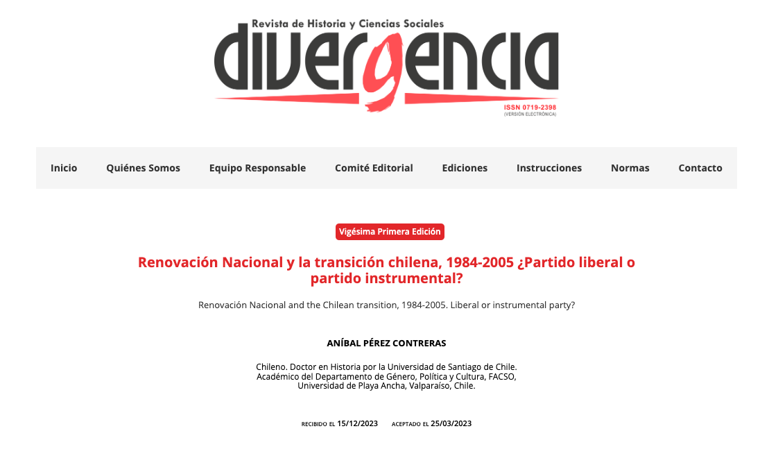 “Divergencia”, publicación chilena de corte semestral, con indexación Scopus nivel Q2, divulga trabajos originales de carácter científico y de opinión, vinculados a las ciencias sociales y enfocados en la historia política contemporánea, como lo es la presente investigación que analiza la historia de Renovación Nacional y discute con aquellas miradas que lo han pensado como un partido renovador y representante de una nueva centro-derecha liberal, de cara a la “democracia de los acuerdos” durante la transición.