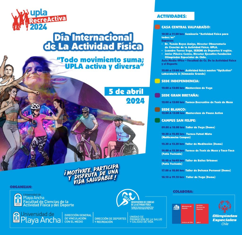 Con el slogan “Todo movimiento suma; UPLA activa y diversa” la Universidad de Playa Ancha celebrará el Día Internacional de la Actividad Física este 5 de abril, en los campus Valparaíso y San Felipe.