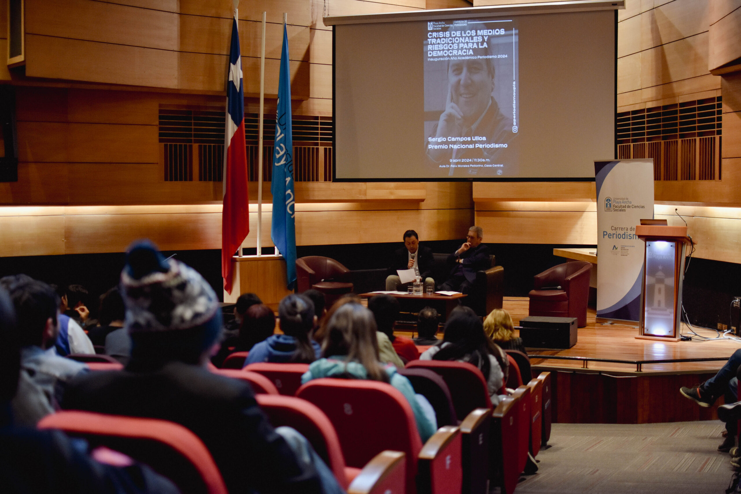 Con una amplia convocatoria de futuros y futuras periodistas, como también de la comunidad de la Universidad de Playa Ancha en general, se efectuó la Inauguración del Año Académico 2024 de la carrera de Periodismo de la Facultad de Ciencias Sociales, la cual contó con la participación de Sergio Campos Ulloa, premio Nacional de Periodismo, quien abordó la temática “Crisis de los medios tradicionales y riesgos para la democracia” en el Aula Dr. Félix Morales Pettorino de Casa Central.