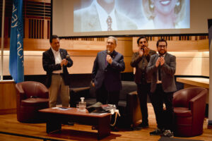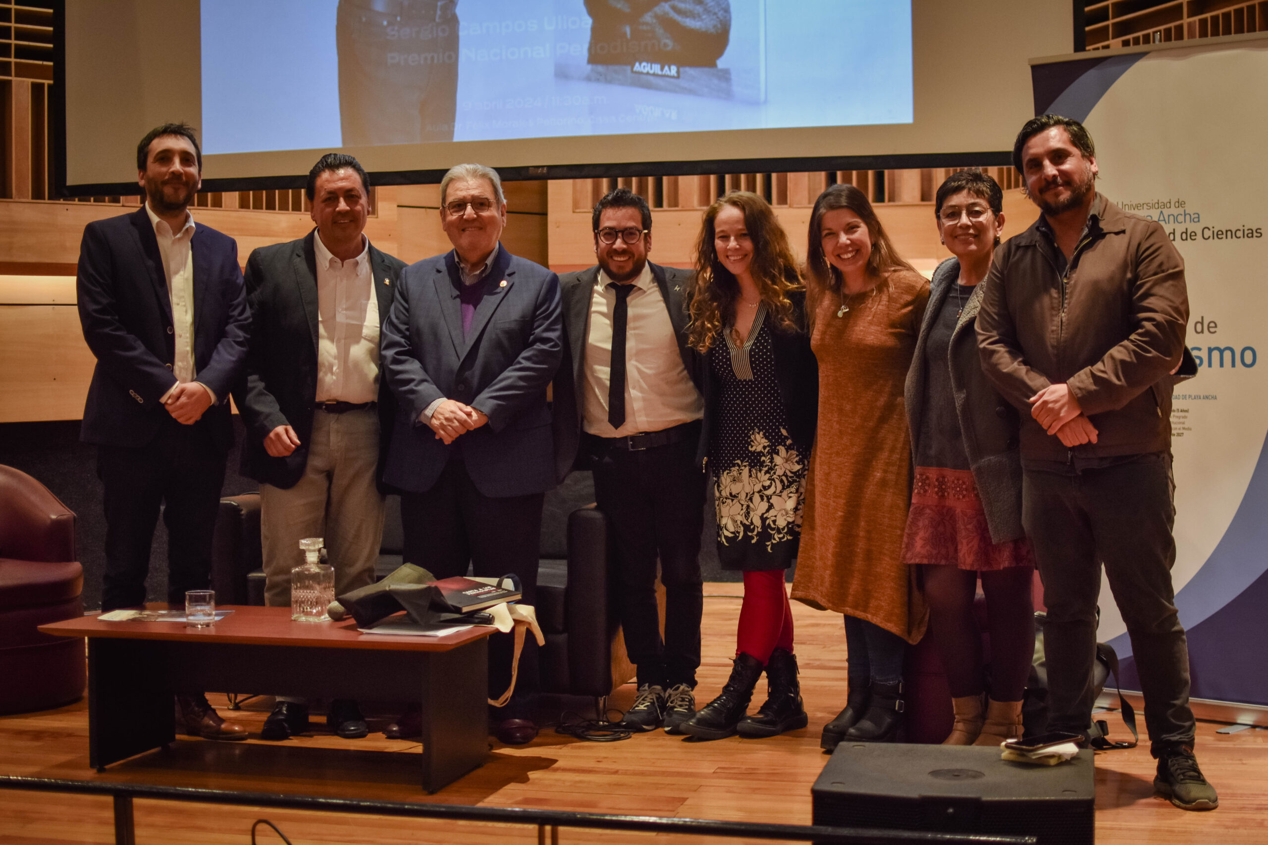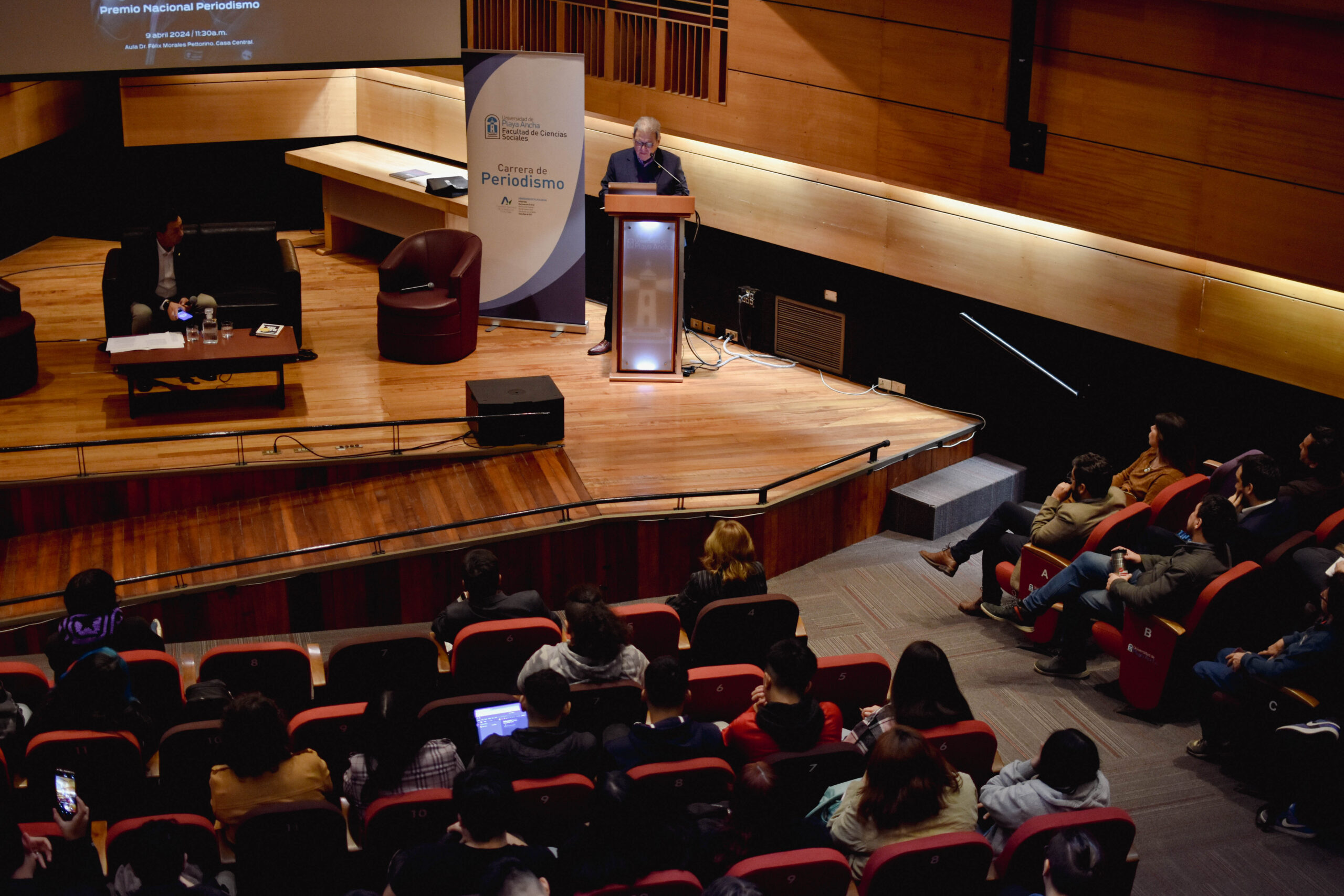 Cabe destacar que el director general de Comunicaciones de la UPLA, Danilo Ahumada Flores, y el director de la carrera de Periodismo, René Celedón Cerda, hicieron entrega de un presente al premio nacional y, de forma posterior, la máxima autoridad de la institución, rector Carlos González Morales, subió al escenario para efectuar una pregunta al invitado, quien tras responder, recibió otro obsequio y prosiguió contestando cuestionamientos, pero esta vez, de la comunidad estudiantil de la carrera.