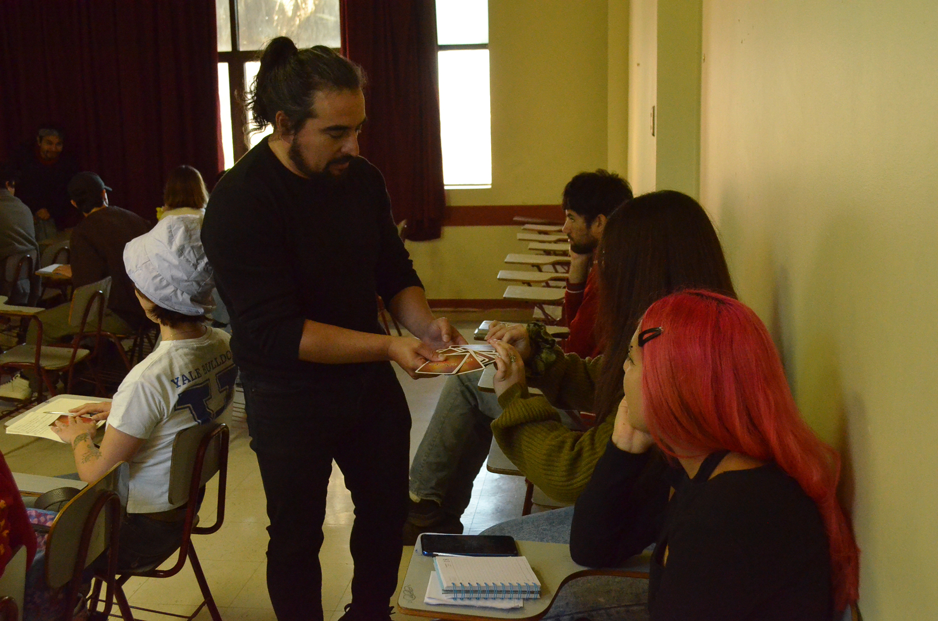 La jornada comenzó en la Facultad de Arte con el taller del académico Nibaldo Cáceres quien desarrolló primeramente una conversación sobre los alcances de la intermedialidad en la creación artística y literaria para luego pasar al taller de escritura propiamente tal, oportunidad en que cada participante plasmó y compartió sus ideas sustentado en una imagen (carta) del juego de mesa Drixit.