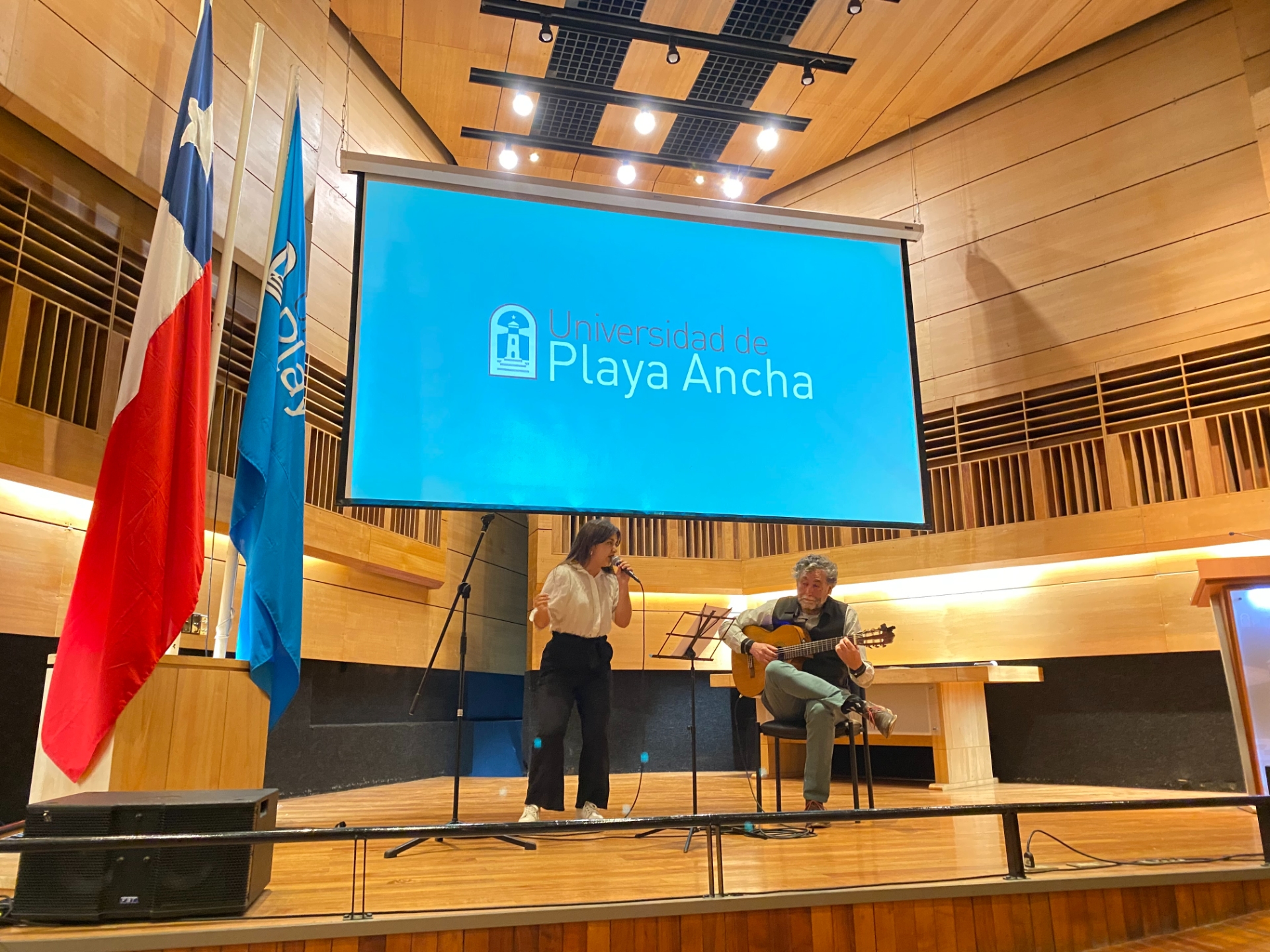 El ambiente emotivo se acentuó con la presentación de los estudiantes de Pedagogía en Educación Musical: Antonia Clavo Martínez (voz), y Marcelo Villar Díaz (guitarra), quienes hicieron una bella pausa musical con la interpretación de tres canciones, una de ellas en inglés.