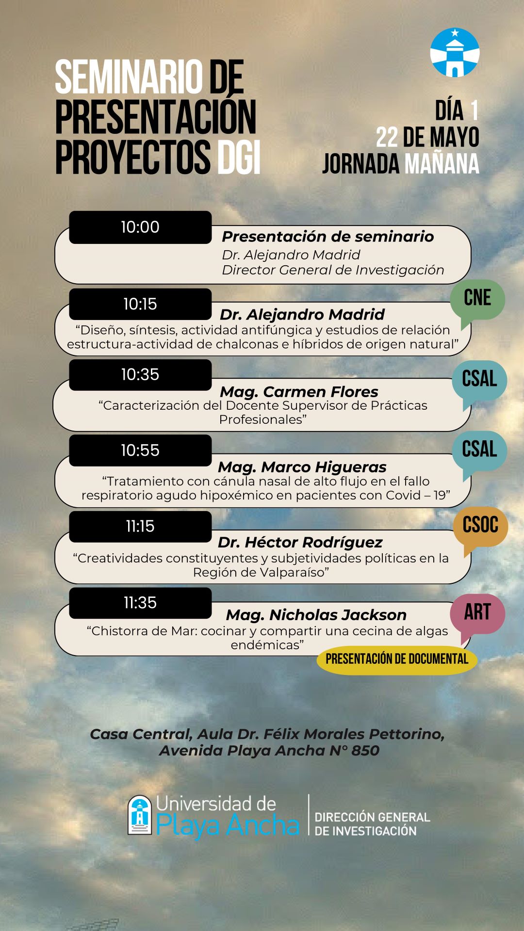 Actividad antifúngica en chalconas e híbridos de origen natural; Rol docente en prácticas profesionales del área de salud; Predictores clínicos en contexto de Covid-19 y Creatividades constituyentes en la región de Valparaíso serán las temáticas de las presentaciones que Alejandro Madrid (Cs. Naturales y Exactas), Carmen Flores (Cs. de la Salud), Marco Higueras (Cs. de la Salud) y Héctor Rodríguez (Cs. Sociales) realizarán a partir de las 10:00 horas, en una jornada que concluirá con la presentación del documental “Chistorra de Mar: cocinar y compartir una cecina de algas endémicas” de Nicholas Jackson (Arte) (Revisar teaser aquí).