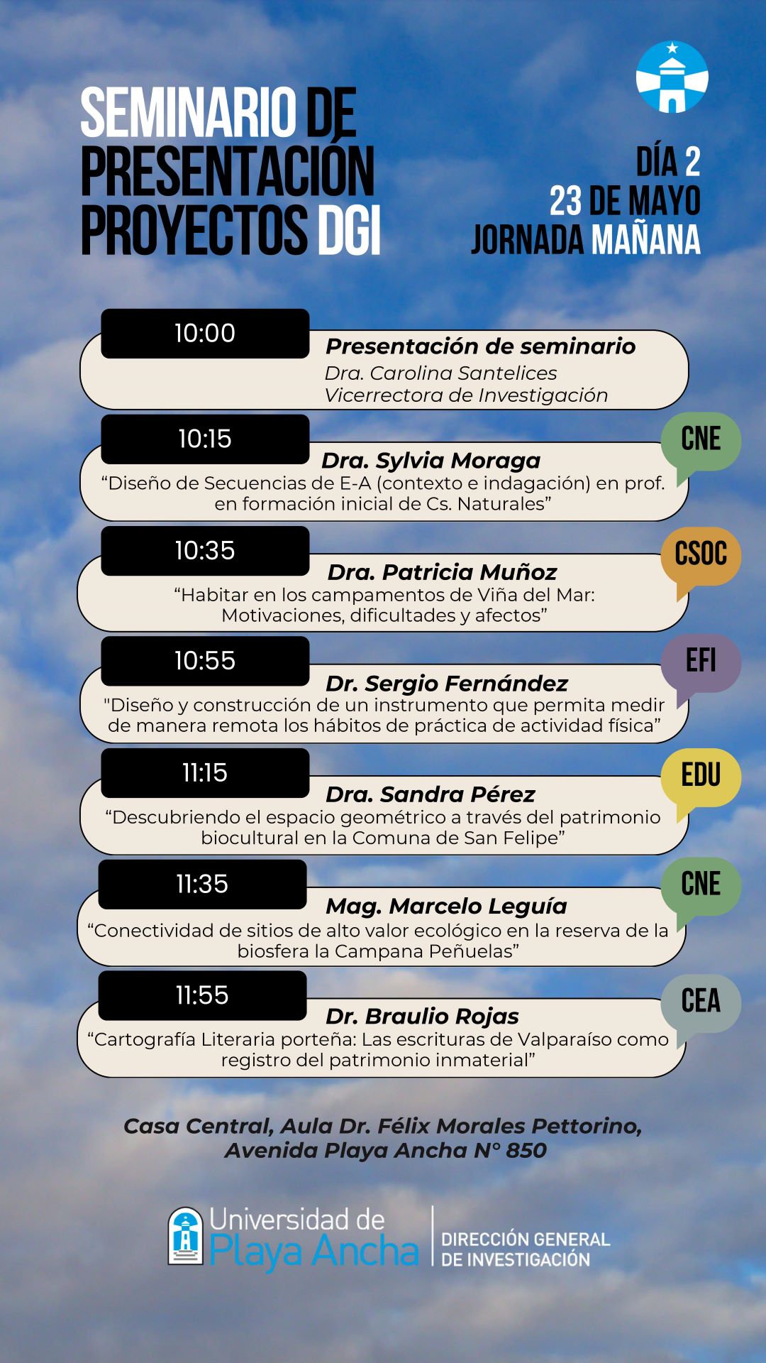 Al día siguiente, desde las 10:00 horas, la última jornada estará compuesta por Sylvia Moraga (Cs. Naturales y Exactas), Patricia Muñoz (Cs. Sociales), Sergio Fernández (Cs. de la Actividad Física y del Deporte), Sandra Pérez (Cs. de la Educación), Marcelo Leguía (Cs. Naturales y Exactas) y Braulio Rojas (Arte), quiénes darán cuenta de los hallazgos realizados en materia de Formación inicial de Cs. Naturales; Motivaciones, dificultades y afectos en los campamentos de Viña del Mar; Medición remota de hábitos de actividad física; Enseñanza del espacio geométrico a través del patrimonio biocultural; Conectividad de sitios de alto valor ecológico de la RB Campana-Peñuelas y Escrituras de Valparaíso como registro del patrimonio inmaterial.