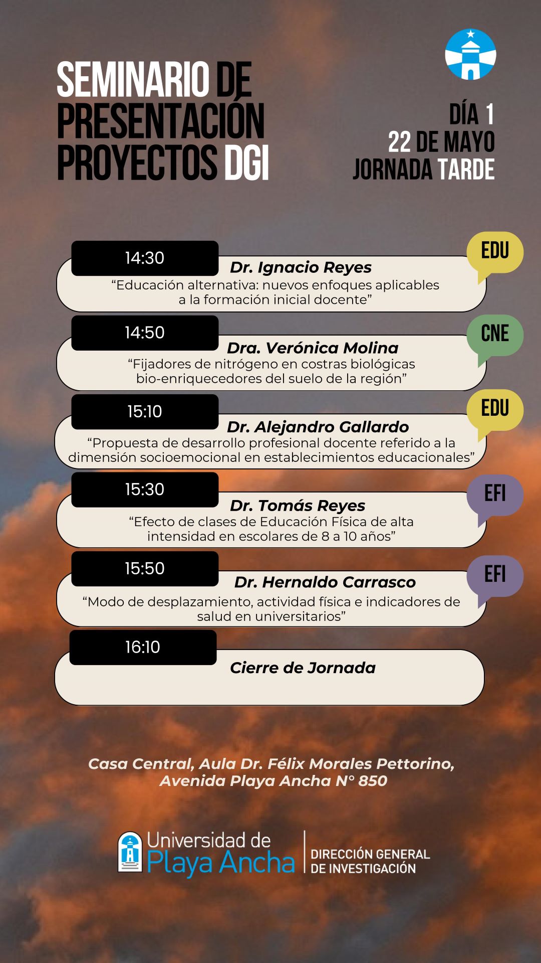 Luego, desde las 14:30, investigaciones centradas en Educación alternativa y formación inicial docente; Fijadores de nitrógeno en costras biológicas del suelo de la región; Desarrollo profesional docente y dimensión socioemocional en establecimientos educacionales; Efectos de clases de educación física de alta intensidad en escolares y modos de desplazamiento; Actividad física e indicadores de salud en universitarios serán presentadas por Ignacio Reyes (Cs. de la Educación), Verónica Molina (Cs. Naturales y Exactas), Alejandro Gallardo (Cs. de la Educación), Tomás Reyes (Cs. de la Actividad Física y del Deporte) y Hernaldo Carrasco (Cs. de la Actividad Física y del Deporte).