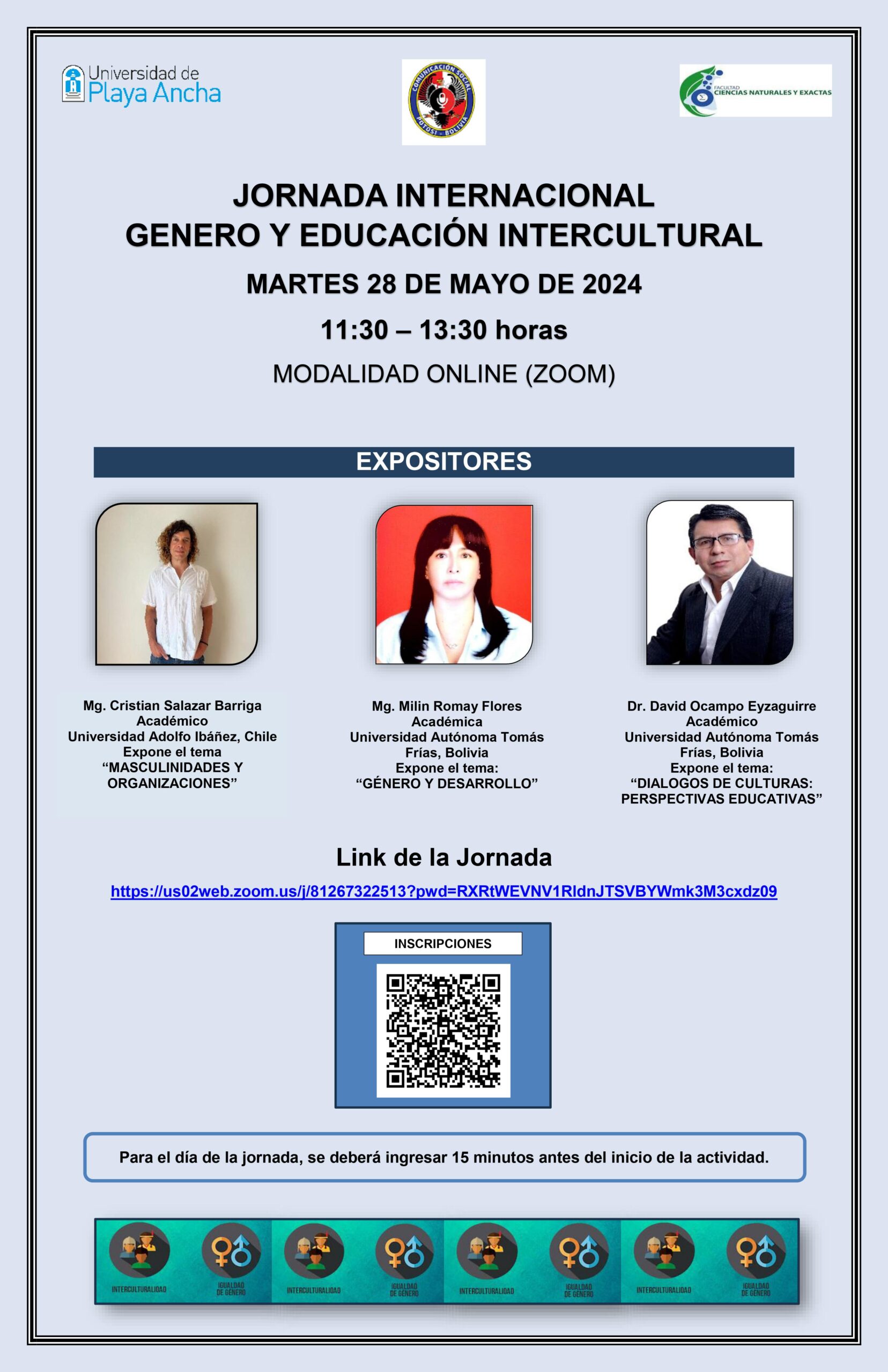 El martes 28 de mayo, a las 11.30 horas, se efectuará la Jornada Internacional de Género y Educación Intercultural, en el marco del curso «Educación con  perspectiva de Género e Interculturalidad», que imparte el académico de la Facultad de Ciencias Naturales y Exactas, de la Universidad de Playa Ancha, Gastón Gaete Coddou.