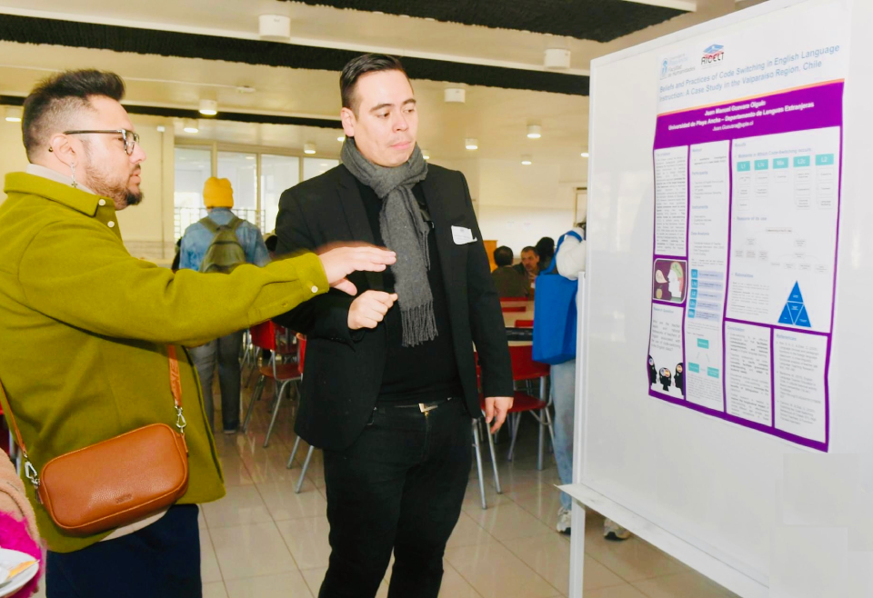 El estudiante del Doctorado Consorciado en Educación de la UPLA, ULagos y UA, se refirió a la alternancia del código lingüístico y las razones del por qué sucede en el aula. Dentro de los principales hallazgos, se develó que el cambio de idioma (Inglés-Español o viceversa) tiene una racionalidad principalmente instrumental y consciente, la cual se realiza para reducir el estrés entre los y las estudiantes, promover la comunicación efectiva en el aula y evaluar, formativamente, el desempeño de estudiantes cuya competencia lingüística es baja.