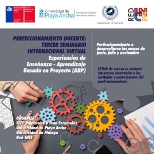 El viernes 14 y 21 de junio el  Departamento de Ciencias y Geografía de la Facultad de Ciencias Naturales y Exactas de la Universidad de Playa Ancha con la colaboración del Grupo de investigación ENCIC de la Universidad de Málaga, RED-INCE y la Coordinación del Área de Ciencias Innovación y Medio Ambiente (CIMA) de los Servicios Locales de Educación Pública (SLEP) de Valparaíso y Juan Fernández, realizarán el «Perfeccionamiento Docente 2024: Tercer Seminario Internacional Virtual. Experiencias de Enseñanza-Aprendizaje basada en Proyecto (ABP)».