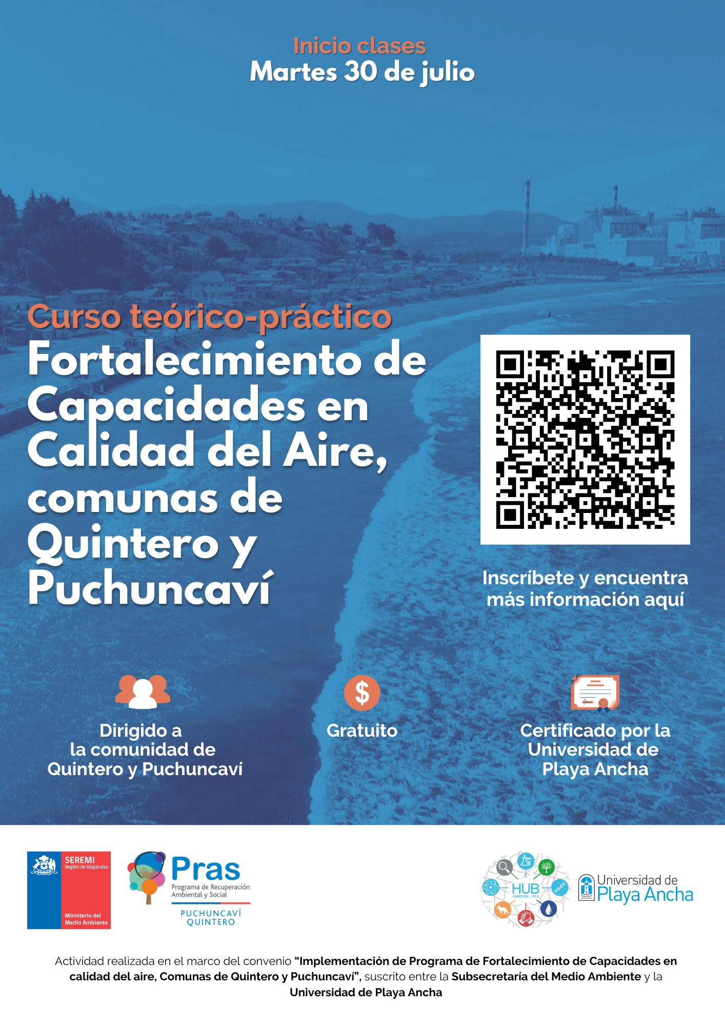 A partir del martes de 30 de julio, se dictará para la comunidad de Quintero y Puchuncaví un Curso de Fortalecimiento de Capacidades en Calidad del Aire, de modalidad teórico-práctica, cuyo diseño tomó en consideración las temáticas e inquietudes expuestas durante la realización de una jornada abierta a la ciudadanía.