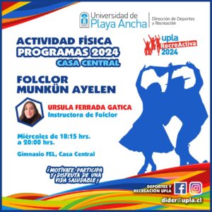 Este segundo semestre la comunidad UPLA está invitada a participar en el programa folclórico «Munkün Ayelen», que se efectuará en Casa Central, con el objetivo de compartir conocimientos de bailes latinoamericanos como cueca, cacharpaya, tinku, bailes pascuenses, patagónicos y nortinos, entre otros.