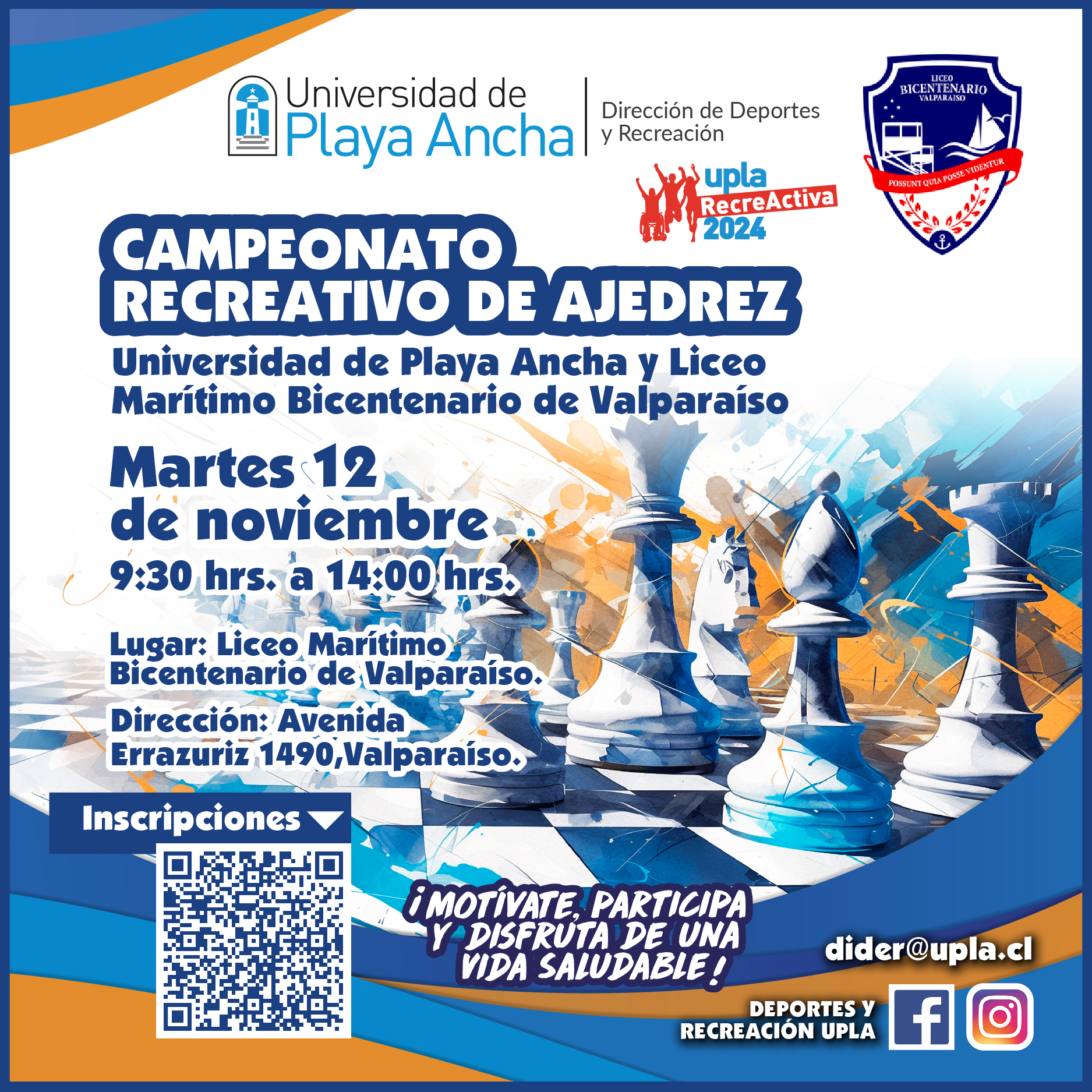 La Dirección de Deportes y Recreación (DIDER), dependiente de la Dirección General de Desarrollo Estudiantil, y el Liceo Marítimo Bicentenario de Valparaíso, invitan a la comunidad estudiantil, funcionaria y académica a participar en el tradicional «Campeonato Recreativo de Ajedrez».