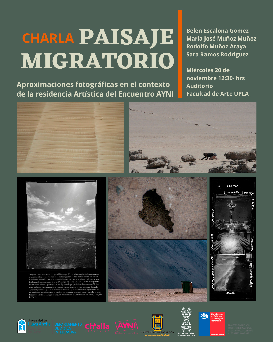 “Paisaje Migratorio, Aproximaciones Fotográficas en el Contexto de la Residencia del Encuentro AYNI”, se titula la charla que ofrecerán estudiantes del Doctorado en Artes Integradas y de la carrera de Licenciatura en Arte de la UPLA el miércoles 20 de noviembre, a las 12:30 horas, en el auditorio de la Facultad de Arte, instancia donde presentarán los resultados de una residencia artística realizada en Arica.