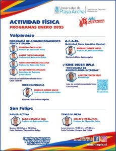 » A toda nuestra comunidad universitaria les invitamos a seguir participando en nuestros Programas de Actividad Física tanto en Valparaíso como en San Felipe, para tener una continuidad en aquellos en los que se han hecho parte, y si no, comenzar este año 2025 con el desafío de regalarle al cuerpo y a la mente una mejor salud. El beneficio de la actividad física es múltiple y qué mejor que practicarla antes del receso, así como adquirir cierta rutina durante el tiempo de descanso», sostuvo el director de Deportes y recreación, Jorge Guzmán Jiménez.