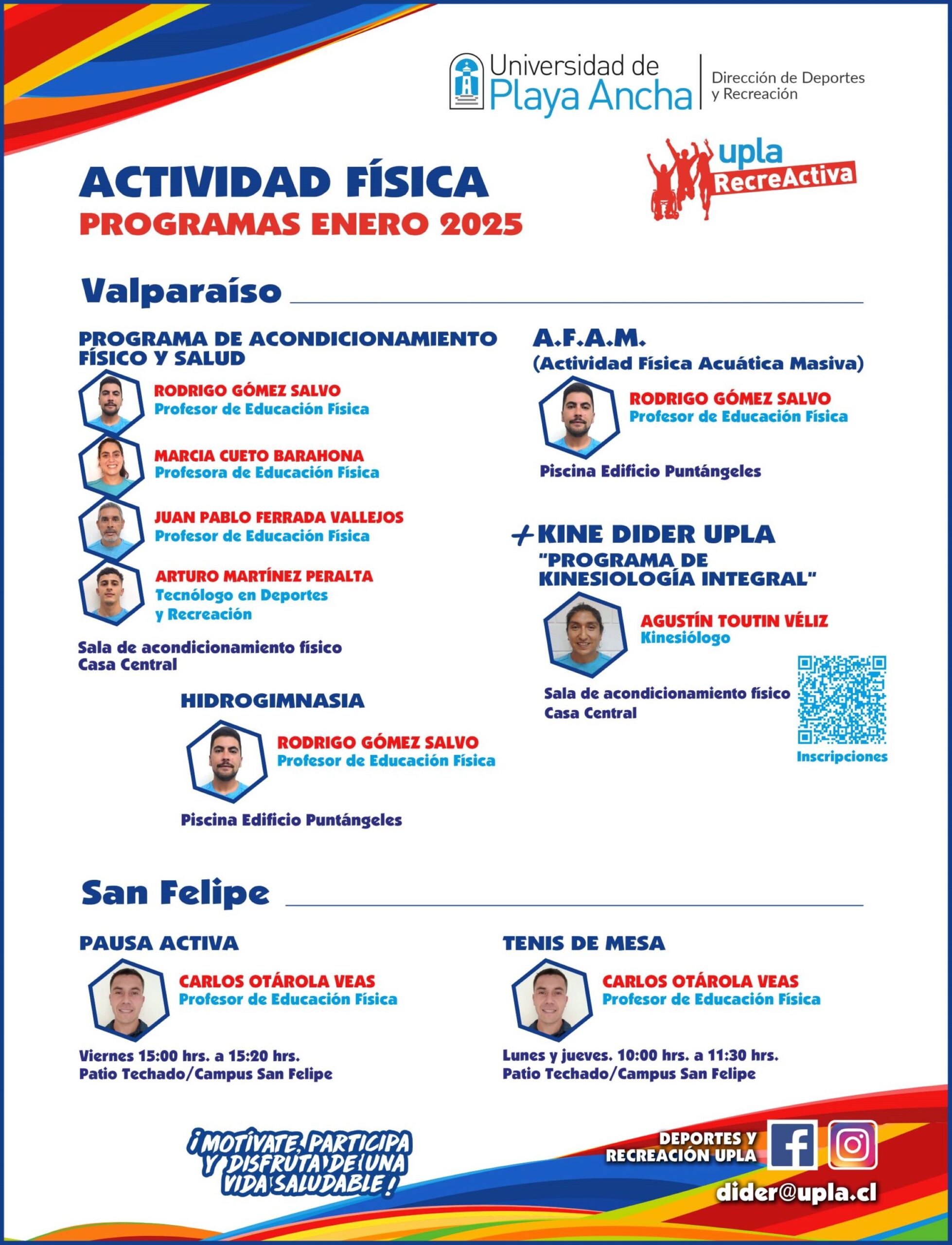 • Para el caso de los programas del Campus San Felipe, los interesados/as deben inscribirse directamente con el coordinador de Deportes, Carlos Otárola Veas.