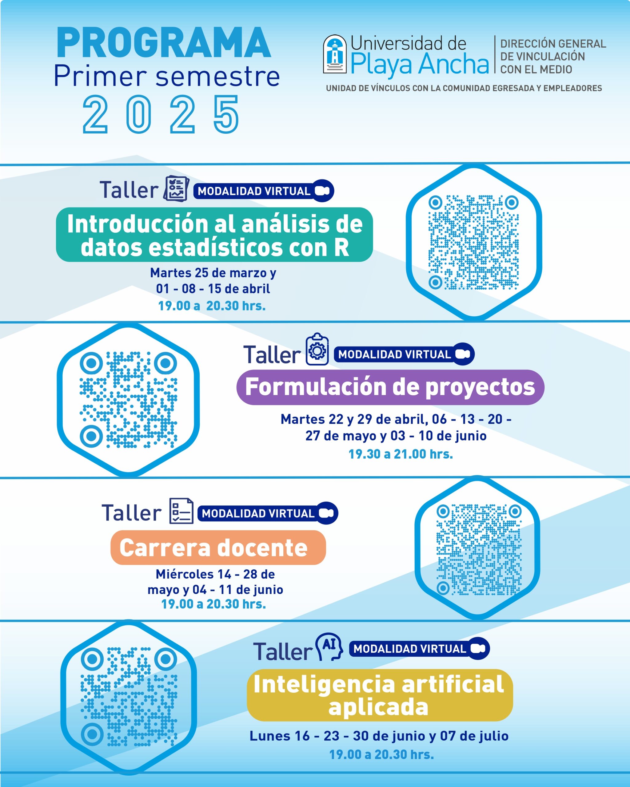 En detalle, la UVCE realizará cuatro talleres durante el primer semestre de 2025, en modalidad online y en horario vespertino, con certificación para las personas que asistan a todas las sesiones de cada taller, y realicen las actividades encomendadas por los relatores.