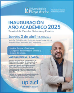 La Facultad de Ciencias Naturales y Exactas inaugurará el año académico 2025 el jueves 3 de abril, a las 11:30 horas, en el Aula Dr. Félix Morales Pettorino de la Universidad de Playa Ancha.