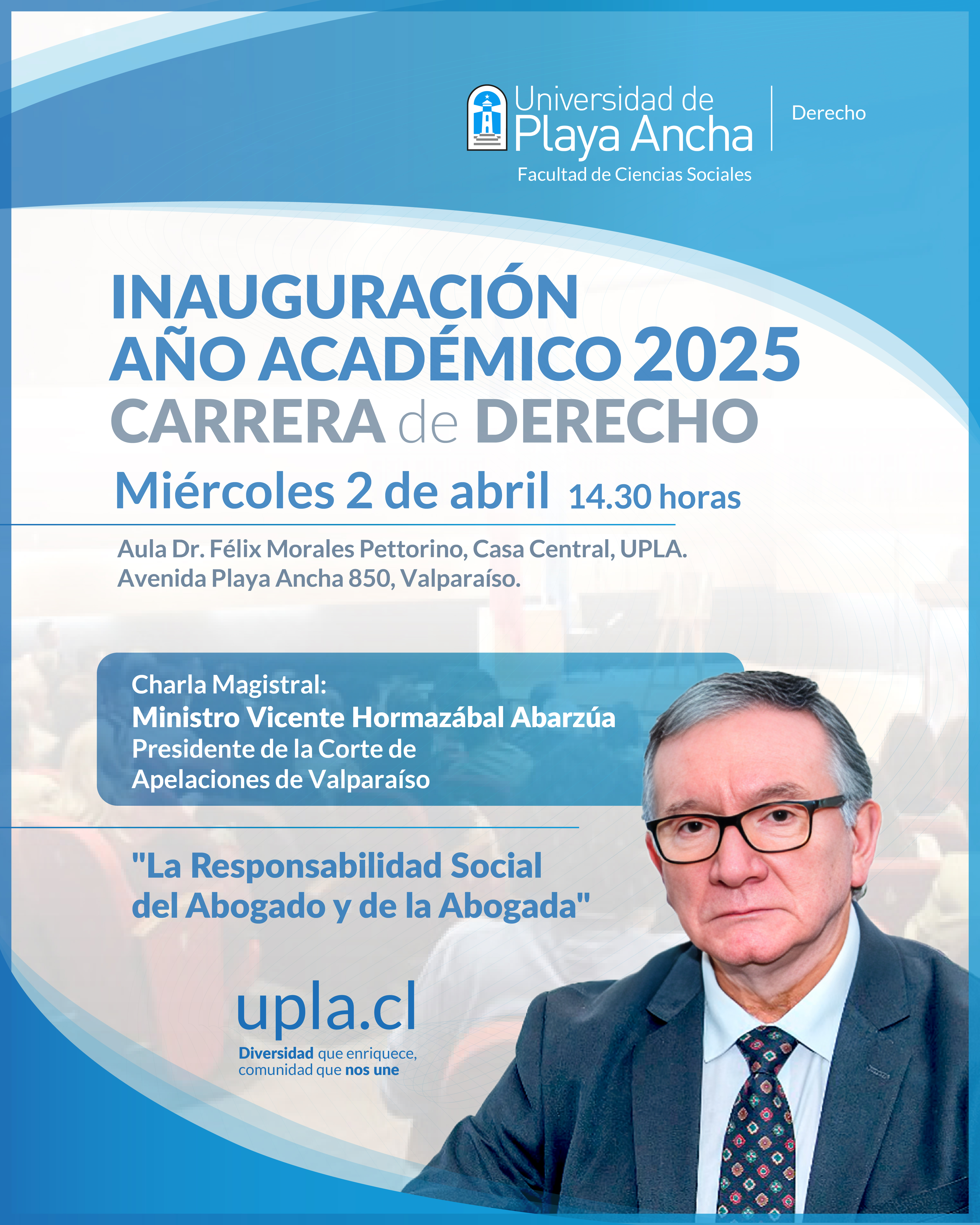 La carrera de Derecho, dependiente de la Facultad de Ciencias Sociales de la Universidad de Playa Ancha (UPLA), invita a la comunidad a participar en la Inauguración de su Año Académico 2025, evento que se efectuará el próximo miércoles 2 de abril, a las 14.30 horas, en el Aula Dr. Félix Morales Pettorino de Casa Central (Av. Playa Ancha 850, Valparaíso).